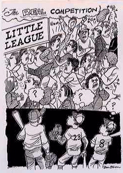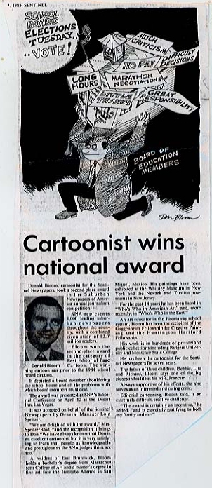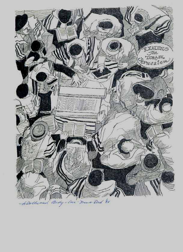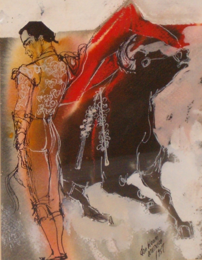 In addition to painting in oils, Bloom's fine hand as an illustrator is most remarkable in his pen and ink on watercolor compositions. In these, watercolor is applied in abstract patches to the paper, then covered over with penned images. Here too he painted vivid street scenes and open air markets, but the pen enabled him to capture in fine strokes more representational themes, especially his popular bullfighting scenes, but also sports and political figures. For Bloom, his pen and ink on watercolor was a crossover to his work as an editorial cartoonist and illustrator. In the late 1960's and 1970's, Blooms canvases became warmer, brighter, and favored greens, yellows, and oranges. He also worked more with the human form, especially beach scenes and parent-and-child themes. Even so, the human form became a model for abstraction; faces and movement were blurred as he focused on the application of color. |