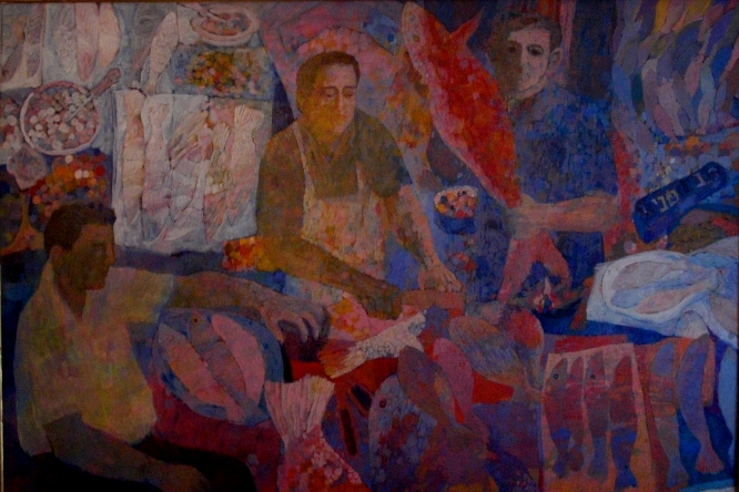 Bloom's early works are darker and exhibit more of an impasto technique, the thick application of paint building up rich textures and shifting the light as it plays on the canvas. Often you will find yourself looking at a spray of lighter colors in a painting and only moments later see that they make up a figure or an object, which seems to emerge luminous from the canvas. Bloom's early subjects are a reflection of his travels, particularly in Mexico, Spain, Turkey, and Israel. He painted from life, taking endless photographs of scenes that captured his imagination. He favored rich, complex images: butcher shops with hanging meats, deli counters filled with everything from anchovies to olives, fish markets, bar counters, and street vendors in busy outdoor markets. Anything with a dizzying variety of forms and textures--and especially images that almost evoke a sense of smell. |