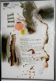 Bloom's subjects for still lifes were often chosen for their unusual shapes: lobster tails, animal skulls, wine and liquor bottles. In the 1980's Bloom experimented with "map art" where countries and borders were his subjects, In the 1990's he began working with canvases shaped as diamonds and circles, often with abstract blobs of colors shaped almost like bones. In July 1995 Bloom created a moving series of 54 mixed-media collages titled Shoah, followed in May 1996 by a second series titled Kaddish, in rememberance of the Holocaust. Today Bloom's work exhibits an almost restless quality; paint is applied in thin layers in abstract washes with much of the canvas peering through. It is unclear whether these are "unfinished" works or whether they represent the ultimate triumph of color over everything: subject, brushstroke, and even the abstract forms themselves. |